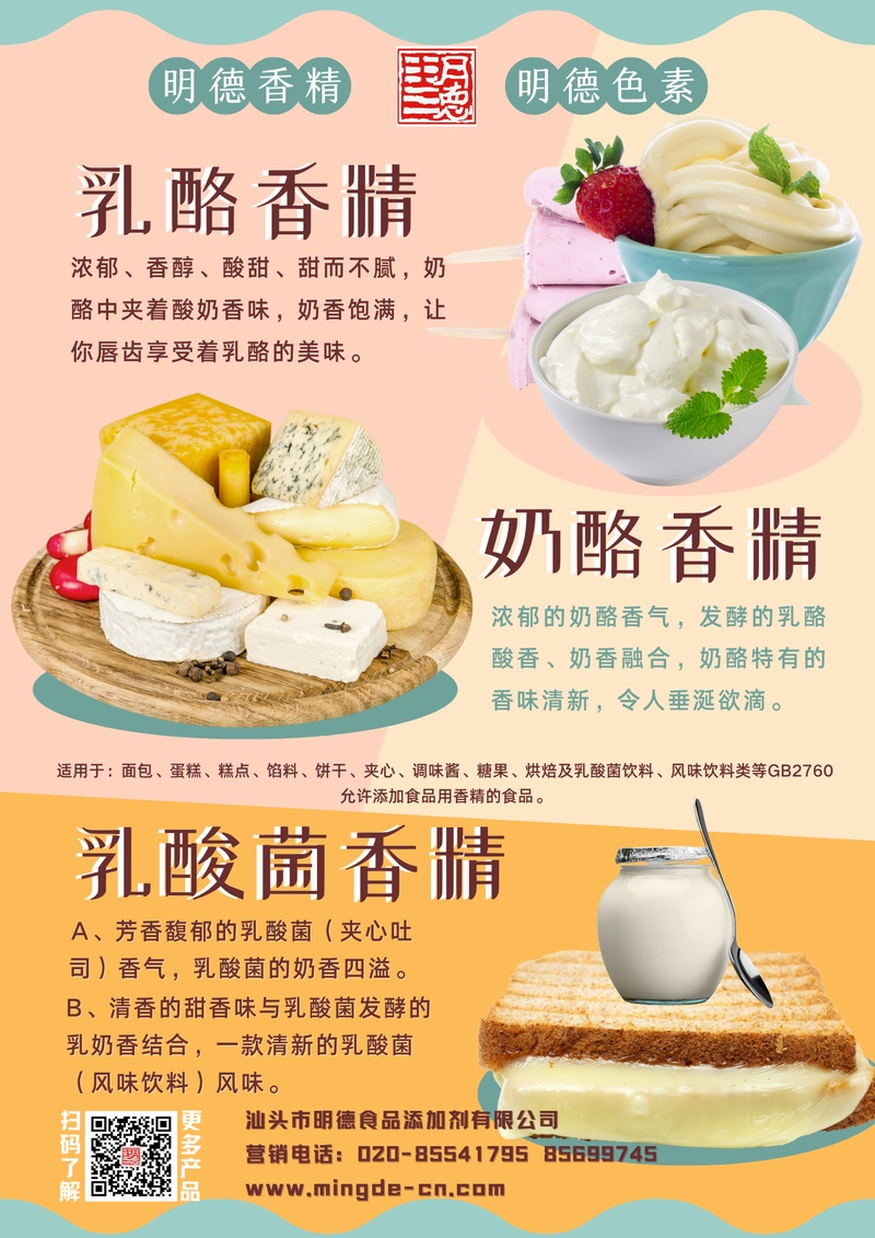 明德乳酪風味系列香精 豐富乳品風味 助力高品質(zhì)應用汕頭市明德食品添加劑有限公司推出的乳酪風味系列香精,涵蓋乳酪香精、奶酪香精、乳酸菌香精等多種調(diào)性,風味層次包括發(fā)酵香、奶香、酸甜香等,留香穩(wěn)定,可滿足烘焙、飲料、糖果及復合調(diào)味等B端工廠的應用需求。